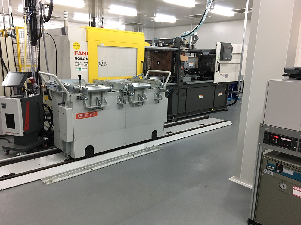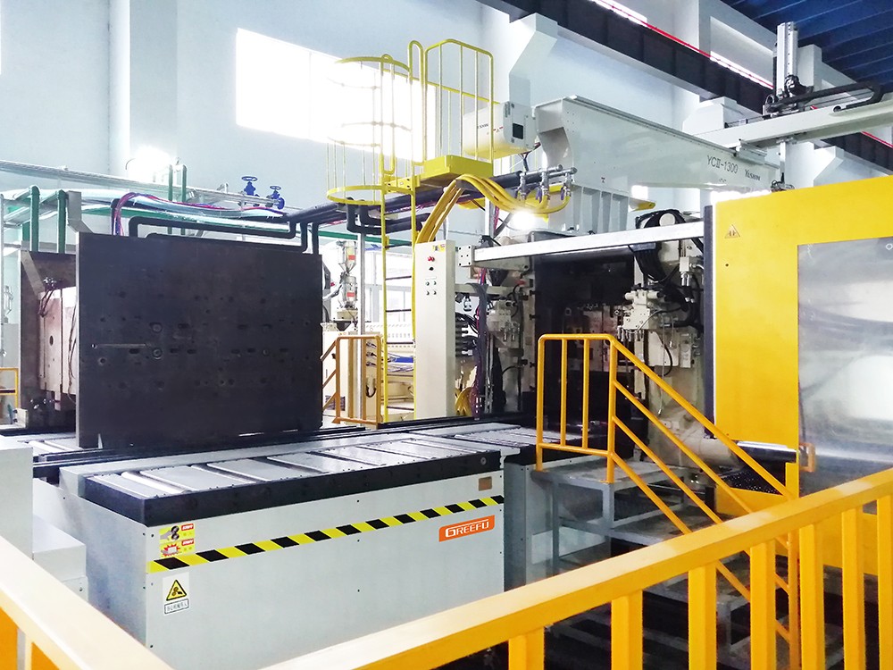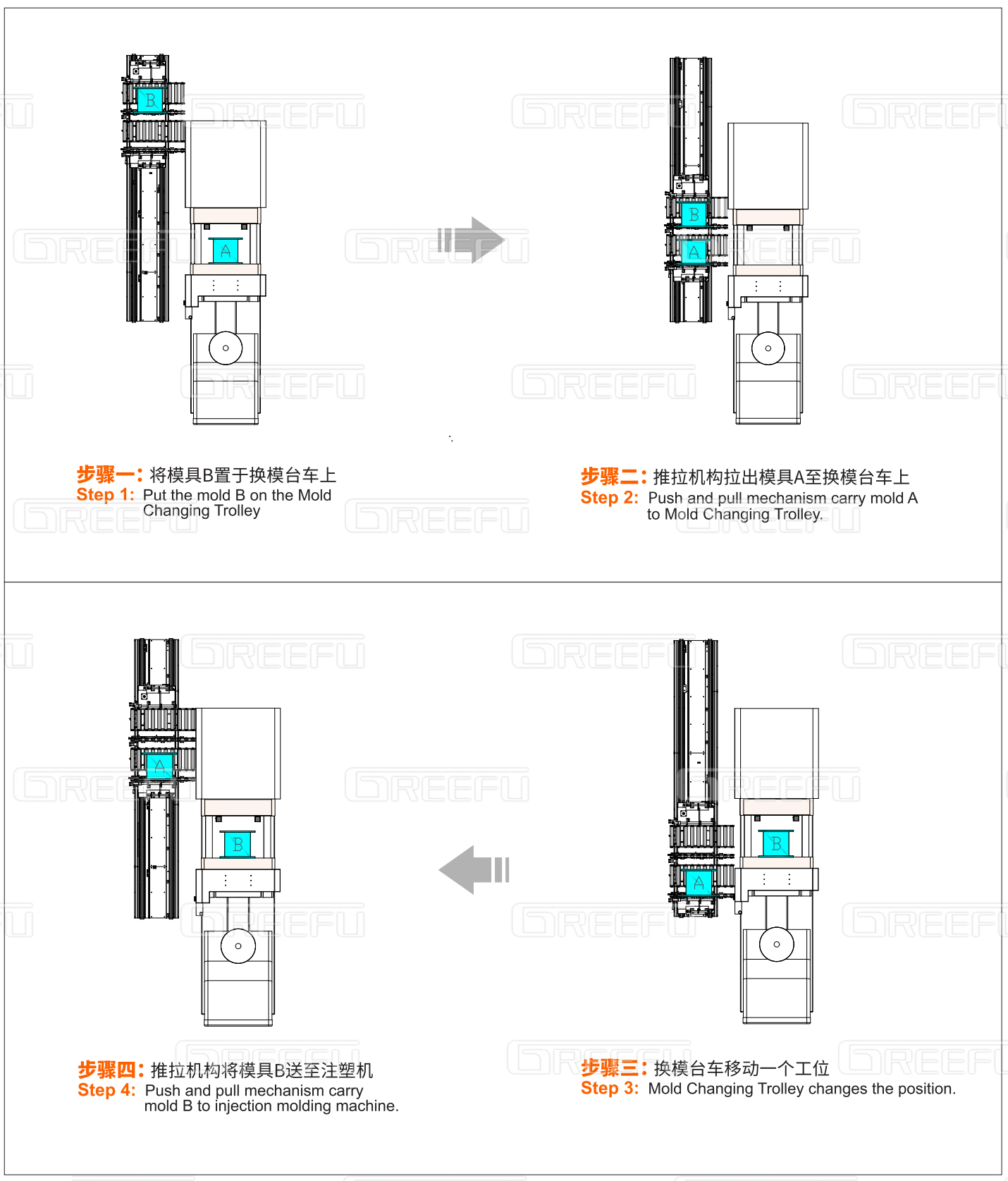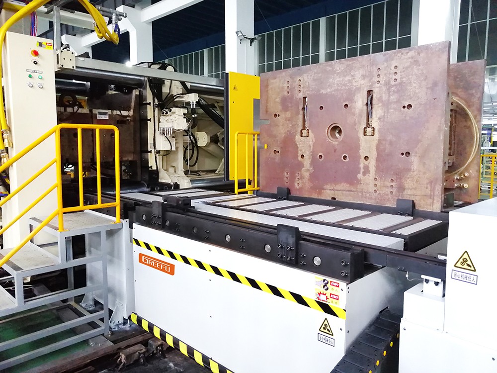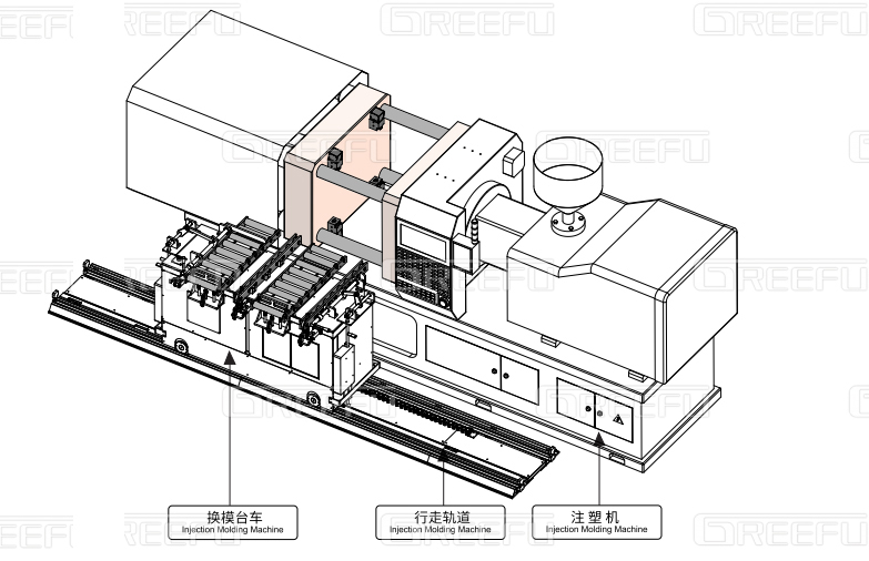 多臺注塑機共用一套自動換模臺車系統(tǒng),該“自動換模臺車系統(tǒng)”能有效解決大型模具的換模作業(yè),如汽車鈑金、家電電梯等行業(yè)沖壓零件,且格萊富可依各種獨立作業(yè)需求研究開發(fā)各種搬運臺車,并可設計單鍵全自動或半自動對模具的搬入搬出,同時,現(xiàn)在該模具輸送系統(tǒng)也已逐漸被業(yè)內接受與采用,尤其是,汽機車零組件等需大型模具的制造業(yè)等。